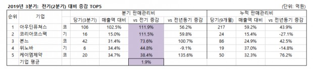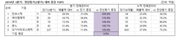 전년동기 대비 증감 TOP5는 진코스텍 395.6%, 케이엠제약 135.6%, 코디 109.4%, 본느 100.7%, 오가닉티코스메틱 100.6% 순으로 기업 평균은 9.9%다.