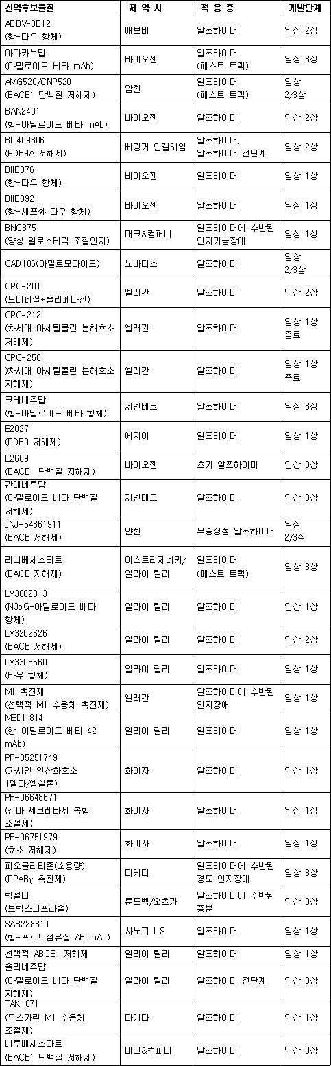다음은 보고서가 개발이 진행 중이라고 소개한 87개 알츠하이머 치료제들 가운데 주요 제약사들이 보유한 신약후보물질들의 개요를 정리한 것이다.