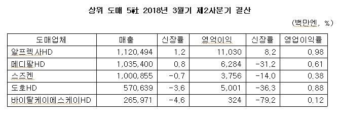 일본 5大 상위 도매상의 2017년 3월기 제2사분기 결산이 발표됐다.