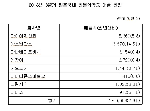 2018년 3월기 일본 전문의약품 매출전망에 따르면 다이이찌산쿄가 다케다를 제치고 2년째 1위 자리를 지킬 전망이다.
