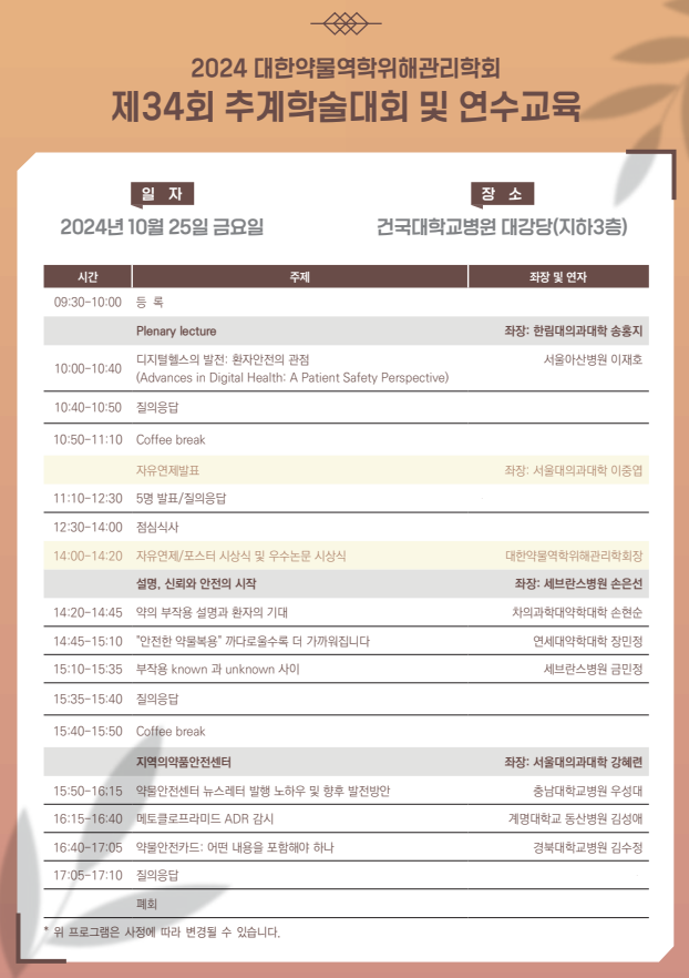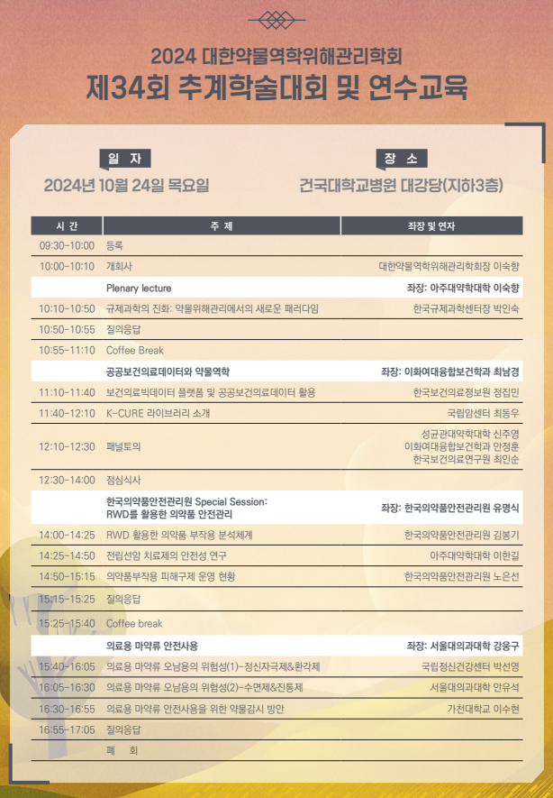 이후 공공보건의료데이터와 약물역학에 관한 강연과 패널 토의가 이어지며, 오후에는 한국의약품안전관리원의 스페셜 세션과 의료용 마약류 안전사용 세션이 준비되어 있다.