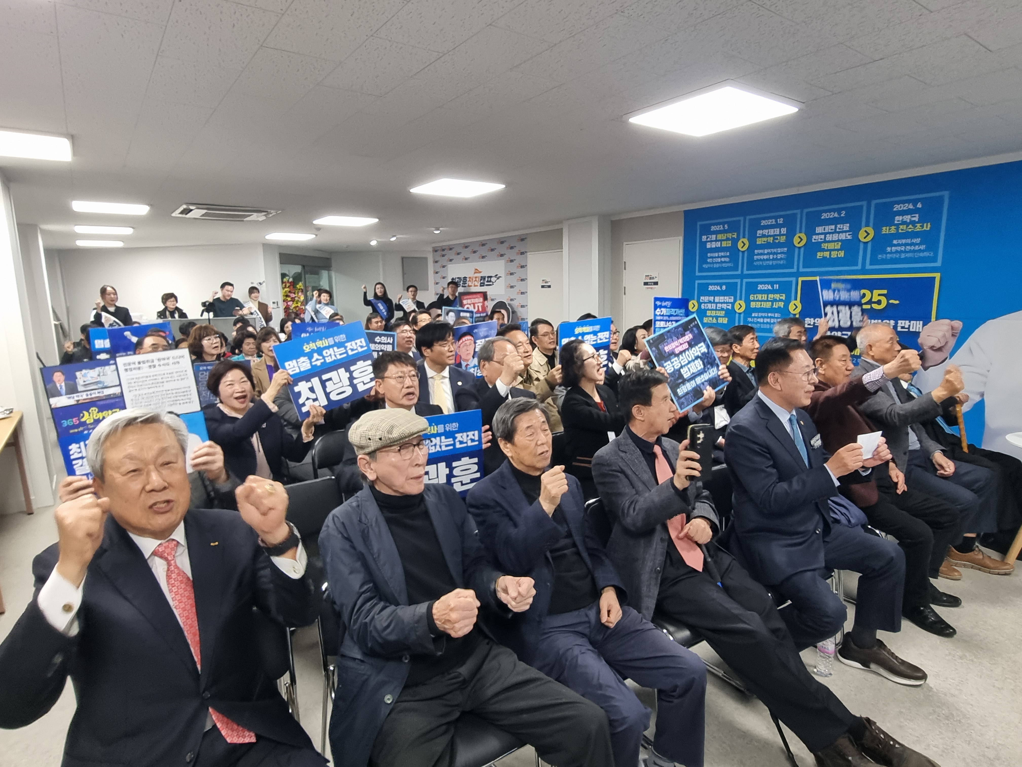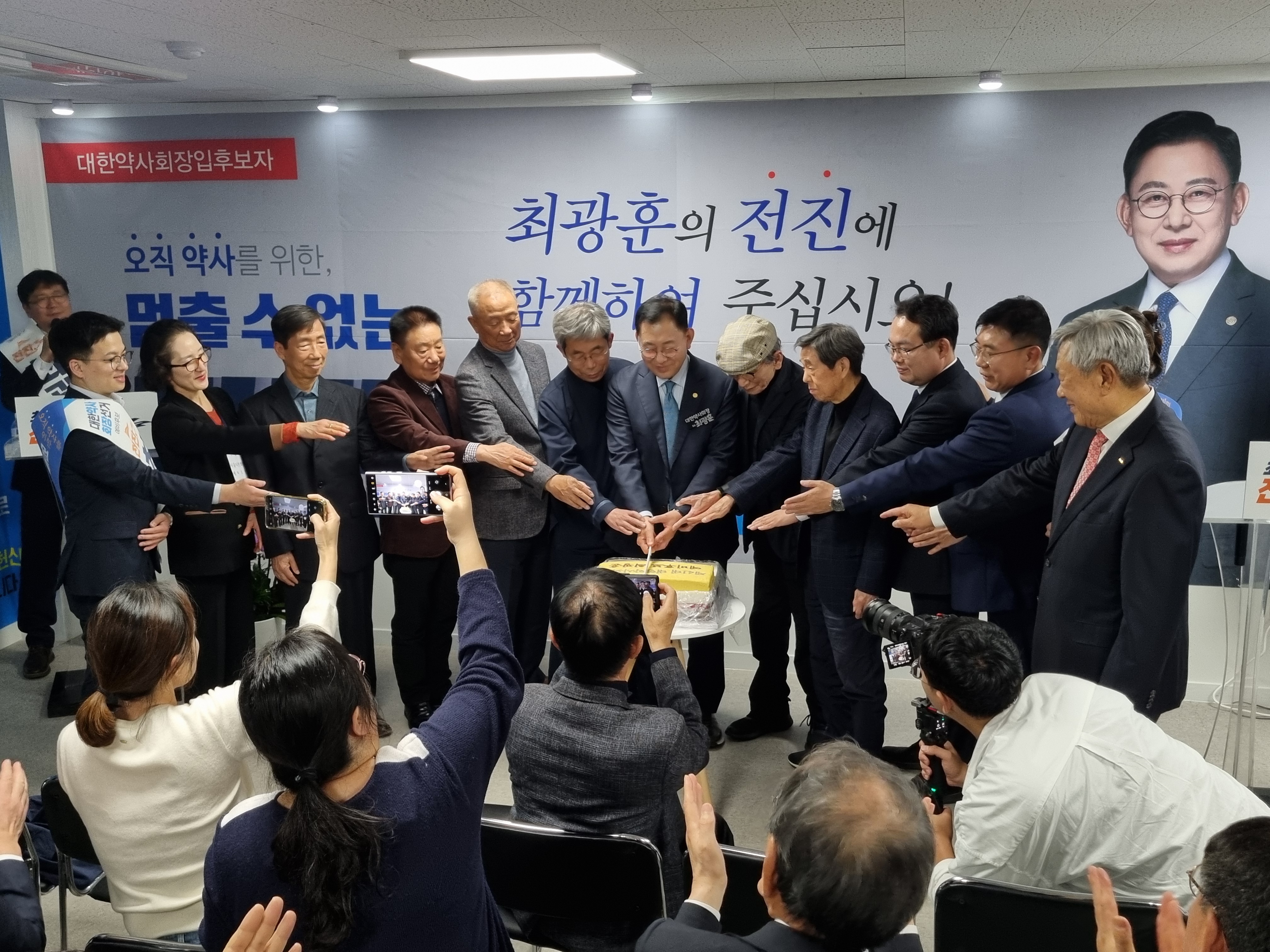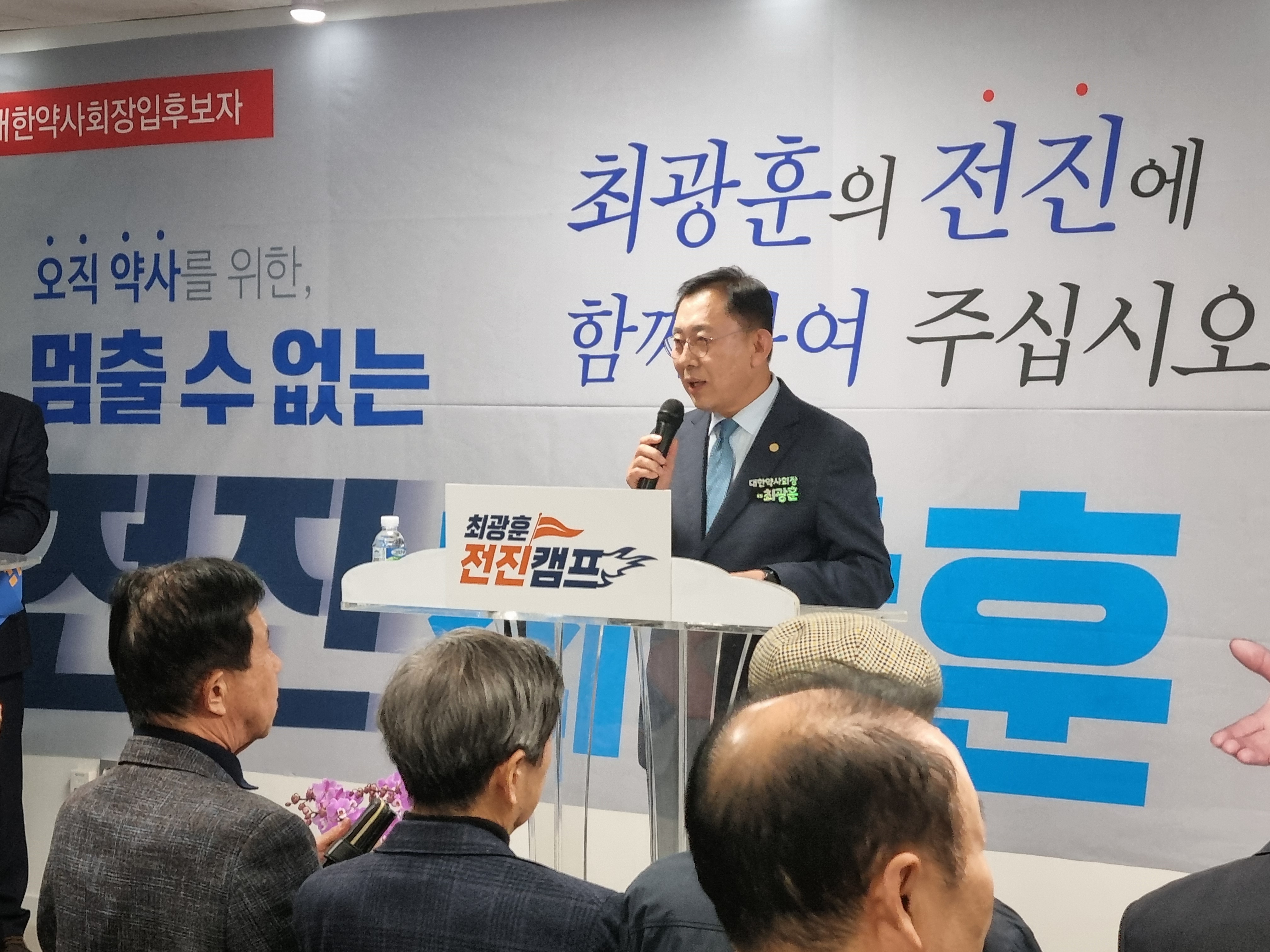 최 후보는 13일 늦은 오후 서울 서초구에 위치한 선거사무소에서 '전진캠프' 개소식을 열고 세몰이를 시작했다. 이날 개소식엔 약사회 전-현직 임원 등 100여 명이 참석해 응원했다. 최 후보 캠프의 선거대책위원장은 김희준 경기도약사회 윤리위원장과 유정사 중앙대학교 약학대학 자문위원이 맡는다.
