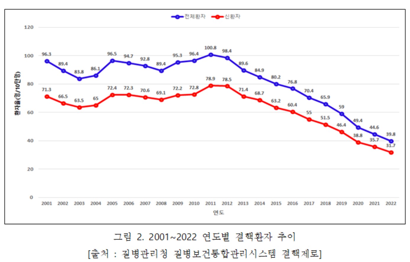 우리나라의 2022년 결핵 신환자 수는 16,264명으로 지난 2011년 최고치를 기록한 후 연평균 7.8%씩 감소해 11년 간 60% 감소했다. 2022년 결핵 전체환자 수는 20,383명으로 전년 대비 11% 감소했다.