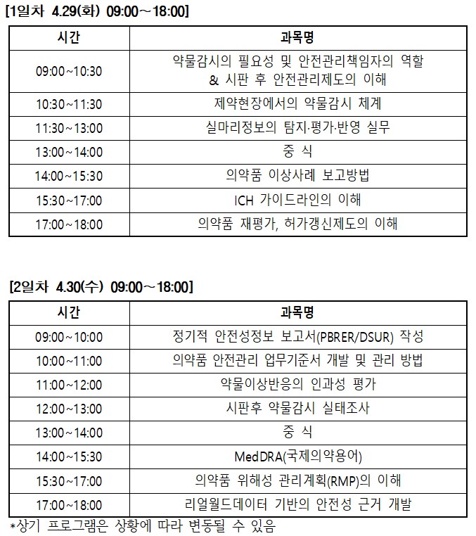 올해 안전관리책임자 교육은 △약물감시의 필요성 및 안전관리책임자의 역할 & 시판 후 안전관리제도의 이해 △제약현장에서의 약물감시 체계 △실마리정보의 탐지·평가·반영 실무 △의약품 이상사례 보고방법 △ICH 가이드라인의 이해 △의약품 재평가, 허가갱신제도의 이해 △정기적 안전성정보 보고서(PBRER/DSUR) 작성 △의약품 안전관리 업무기준서 개발 및 관리 방법 △약물이상반응의 인과성 평가 △시판후 약물감시 실태조사 △MedDRA(국제의약용어) △의약품 위해성 관리계획(RMP)의 이해 △리얼월드데이터 기반의 안전성 근거 개발 등의 프로그램을 준비하고 있다.