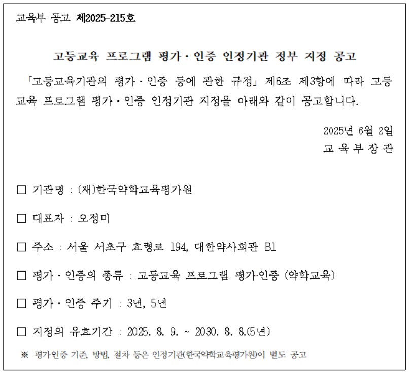 이번 재지정은 약학교육과 약사면허 제도의 연계성 확보 차원에서도 중요한 의미를 갖는다. 개정 약사법 제3조는 평가인증기구의 인증을 받은 약학대학 졸업자에 한해 약사 국가시험 응시를 허용하고 있어, 약평원의 인정기관 지위가 유지됨으로써 관련 제도 시행에도 차질이 없을 전망이다.