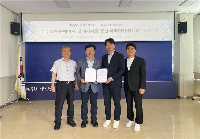 (왼쪽부터) 서영준 부회장, 연제덕 회장, ㈜바로팜 김슬기 대표, 신경도 부대표. ©경기도약사회경기도약사회(회장 연제덕)와 약국 경영 토탈 플랫폼 ㈜바로팜(대표이사 김슬기)이 5일 약국경영 활성화를 위한 업무협약을 체결했다.