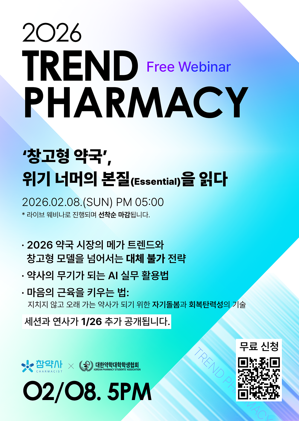 이번 웨비나에서는 ▲2026 약국 시장의 메가 트렌드와 창고형 모델을 넘어서는 ‘대체 불가’ 전략 ▲약사의 무기가 되는 AI 실무 활용법 ▲약사 번아웃을 줄이는 ‘마음의 근육’ 관리법 등 실질적인 주제를 다룬다. 특히 창고형 약국의 확산이 약사 사회에 미치는 시사점과 구조적 변화를 분석하고, 그 안에서 약국의 차별성과 지속가능성을 확보할 수 있는 전략적 인사이트를 공유할 예정이어서 주목된다.
