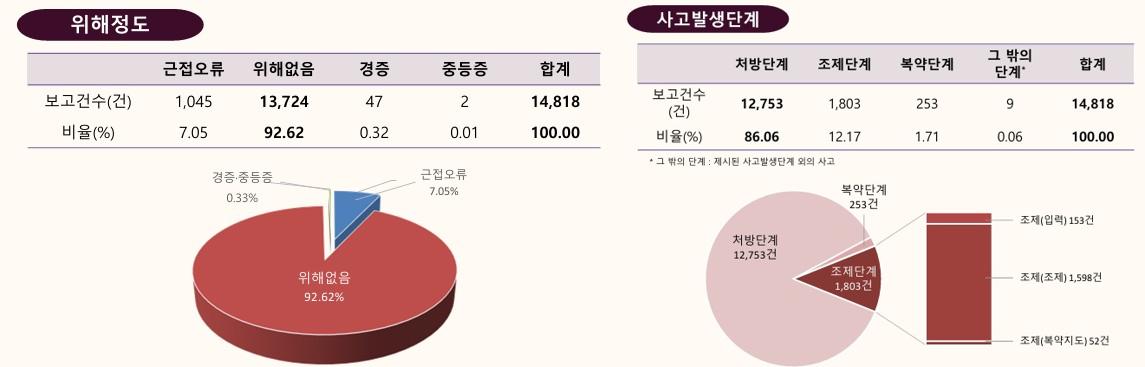 전체 보고 건의 위해 정도를 분석한 결과, ‘위해 없음’이 1만3724건(92.6%)으로 대부분을 차지했다. 이어 ‘근접오류’ 1045건(7.1%), ‘경증’ 47건(0.32%), ‘중등증’ 2건(0.01%) 순이었다.