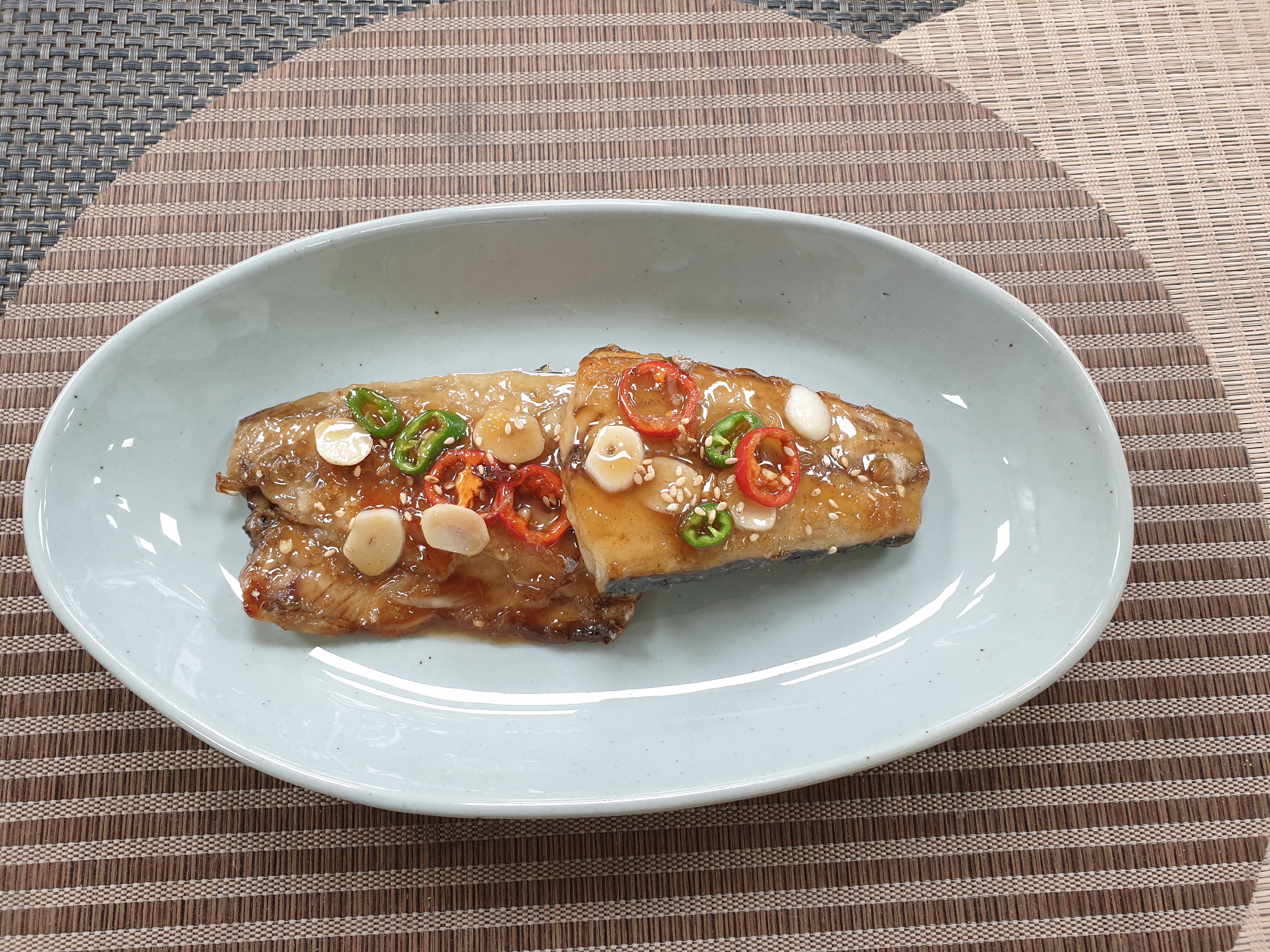 ④ 분량의 양념장에 저민 마늘을 넣어 바글바글 끓인 뒤 ③의 생선을 넣어 조린 뒤 송송 썬 청·홍고추와 통깨를 올려 완성한다.