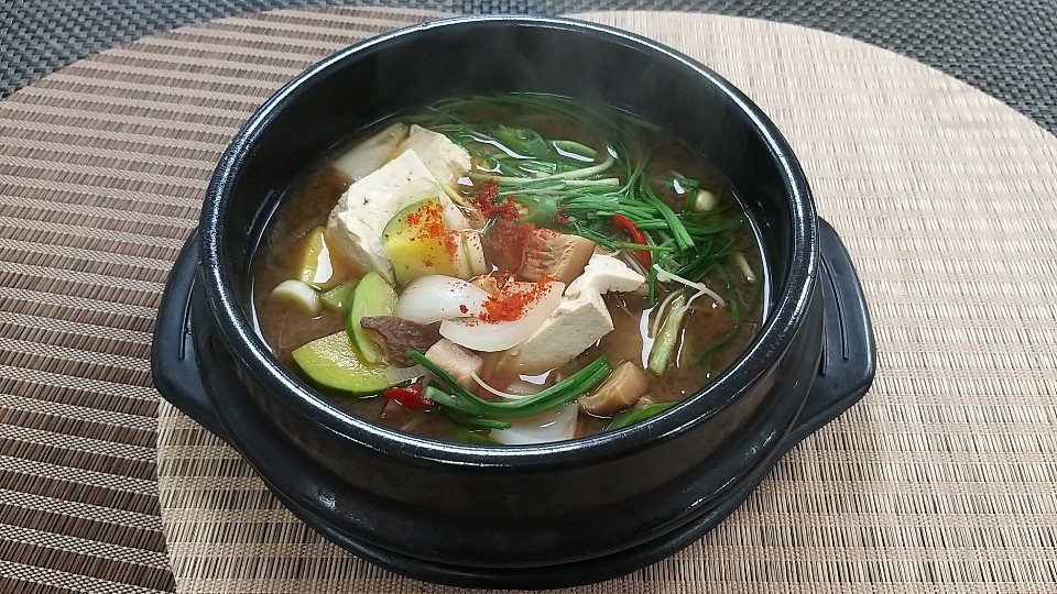 ④ 육수에 된장을 풀고 감자와 표고버섯을 먼저 넣고 끓이다가 양파 호박 고추 두부를 넣고 한소끔 더 끓이다가 대파 마늘 고춧가루를 넣고 마무리한다.