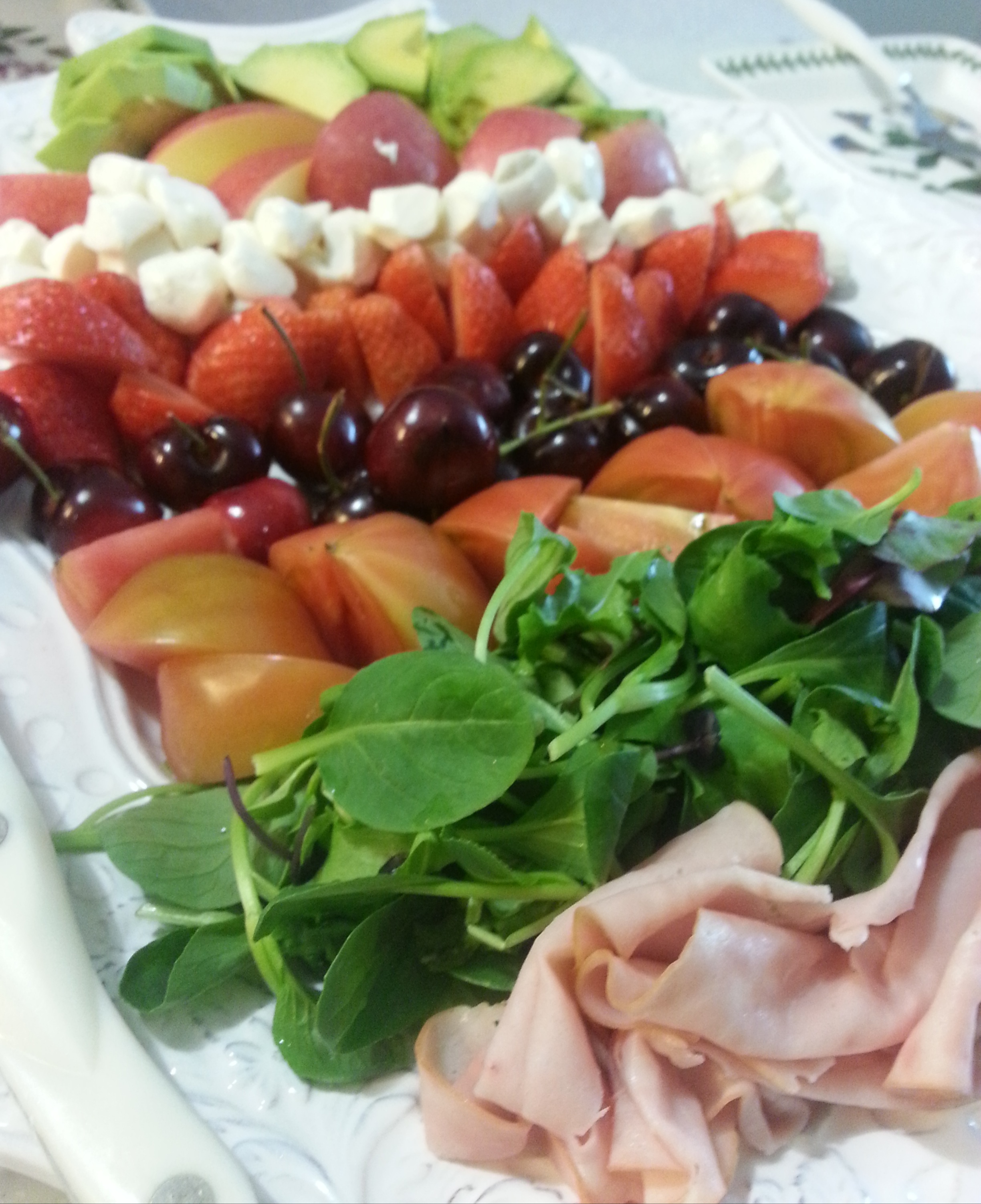 사과·아보카도 ½개씩, 후레쉬리코타치즈 100g, 딸기 6개, 체리 10알, 토마토 1개, 베이비채소 30g, 하몽 50g, 발사믹드레싱