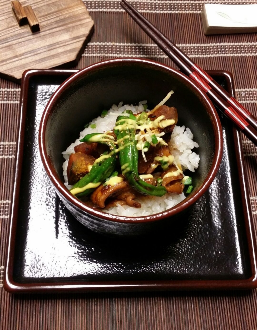 닭다리살 1개, 오일, 단호박 50g, 꽈리고추 3개, 마리네이드소스(다진마늘 5g, 후추 약간, 맛술 2큰술, 간장 1큰술), 시판용 데리야끼소스·물 100㏄씩 , 영소스(마요네즈·머스터드 ½큰술씩), 시치미 약간, 실파 2줄기, 생강채 1쪽, 밥 1공기
