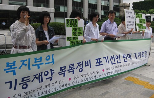 이날 기자회견에서 김경자 민주노총 사회공공성강화위원장은 "기등재약 목록정비의 본래 취지를 포기하는 것이 경제성 평가가 어렵고 전문가가 없다고 판단된다면 지금까지 해왔던 것은 무엇인가"라고 반박했다.