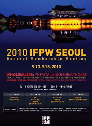 한국의약품도매협회와 국제의약품도매연맹(이하 IFPW)이 주관하는 2010 IFPW 서울총회가 오늘 개막된다. 개막식은 오전 9시 신라호텔에서 개최된다.