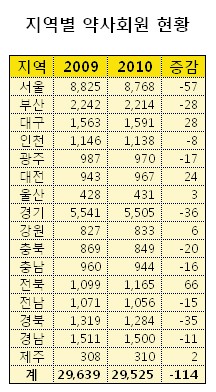 지역별로는 거대 시도 약사회에 속하는 서울과 경기, 부산, 경북 등의 회원 감소가 많은 편이고, 반대로 전북과 대구, 대전에서는 전체 회원 감소에도 불구하고 회원이 증가했다.