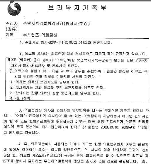 이에 보건복지부가 2010년 3월 2일 의료자원과-1541 유권해석을 통해 IPL이 한의학적 근거가 없는 무면허의료행위에 해당될 수 있다는 판단을 했던 자료를 제시, “1년 남짓 지난 지금의 시점에서 유권해석을 뒤집는 답변을 한 데 대해 경악하지 않을 수 없다”고 말했다.