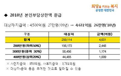 보건복지부와 국민건강보험공단은 2010년도 건강보험료 정산이 마무리되고, 본인부담상한액이 확정됨에 따라 지난해 요양기관에서 사용한 진료비 가운데 본인부담상한제 상한액을 초과한 금액에 대해 이르면 7월 13일부터 환급을 실시한다고 밝혔다.