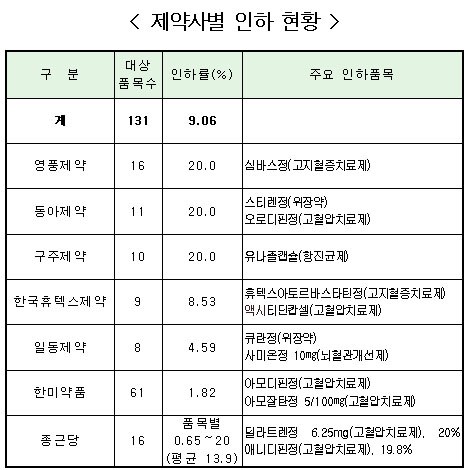 가격이 인하되는 의약품은 7개 제약사의 131개 품목으로 철원군보건소 등에 근무하는 공중보건의사에게 의약품의 처방대가로 뇌물을 제공하여 적발된 6개 제약사의 115품목과 의약품 판매 촉진을 목적으로 의료인에게 금전을 제공해 식품의약품안전청에 적발된 종근당의 16품목이다.