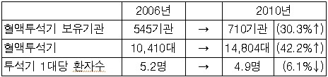 혈액투석 환자는 58,232명, 진료비는 1조 3,643억원으로 2006년에 비해 각각 31.9%, 60.7% 증가했다.
