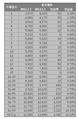 개편안에 따라 2012년 인상분을 반영한 총조제료를 살펴보면 25개 구간 가운데 감소하는 구간이 없다. 다만 6일과 8일, 15일 등 일부 구간의 인상율이 0%이고, 수가인상률에 못미치는 2.5% 이하 구간이 전체 가운데 17개에 달한다.