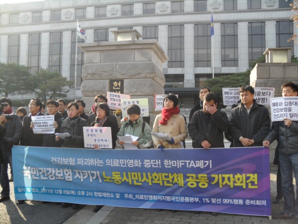 의료민영화 저지와 보장성 강화를 위한 범국민운동본부 등 40여개의 시민사회단체는 공판에 앞서 오후 2시 헌법재판소 앞에서 공동 기자회견을 열고 “재정분리는 건강보험과 국민의 의료권을 위협하는 것”이라고 목소리를 높였다.