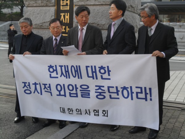 의사협회 경만호 회장은 “의료민영화를 반대하는 사람들이 헌법소원 청구 취지를 왜곡하고 있다”며 “헌재의 판결에 영향을 미치는 정치적 외압은 없어야 하며 헌법소원은 의료민영화와 전혀 관계가 없다”는 입장을 밝혔다.