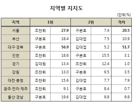 서울의 경우 조찬휘 예상후보는 27.9%를 기록해 2위를 기록한 구본호 예상후보의 7.4%와 현격한 차이를 보였다. 또, 조 예상후보는 인천(18.6%)과 충청(15.6%) 지역에서 2위권과의 격차를 벌렸다.