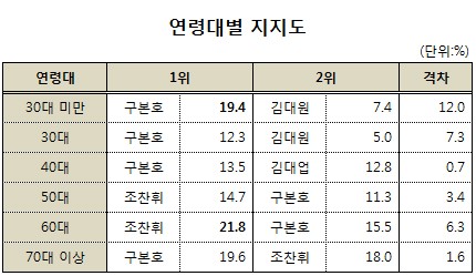 연령별 지지도 분포는 젊을수록 구본호 예상후보에 대한 지지도가 높은 것으로 나타났으며, 조찬휘 예상후보의 경우 50·60대에서 상대적으로 높은 지지도를 기록했다.