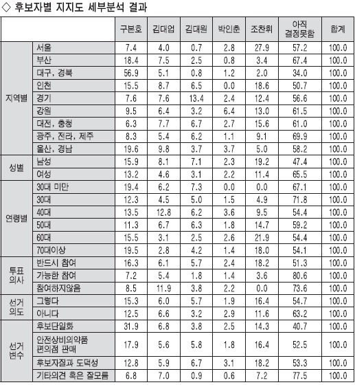 반대로 지지 후보를 결정하지 못했다는 비율이 상대적으로 가장 낮은 지역은 대구·경북 지역으로 34.0%인 것으로 조사됐다.