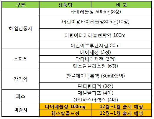 그러나 당장 15일부터 판매가능한 품목은 타이레놀 160mg과 훼스탈골드정을 제외한 11품목이다. 타이레놀 160mg은 내년 2월, 훼스탈골드정은 올해 12월 경 시판될 예정이다.