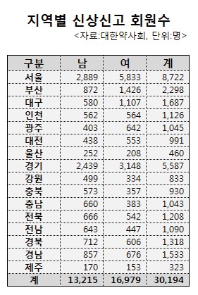 대한약사회 신상신고 회원은 지난 1984년 2만명을 돌파한 이래 1996년 2만 8,892명을 기록했다가 점차 하락했지만 2001년부터 다시 증가해 지난해 처음으로 3만명을 넘어섰다.