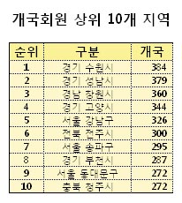 또, 전북 전주시(300명), 서울 송파구(295명), 경기 부천시(287명), 서울 동대문구(272명), 충북 청주시(272명), 서울 도봉·강북구(271명) 등도 개국회원이 많은 것으로 파악됐다.