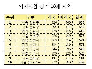 강남구는 모두 326명의 개국회원과 제약사나 도매업체 등에 근무하는 비개국회원 660명을 포함해 1,000명에 가까운 회원이 있는 것으로 나타났다.