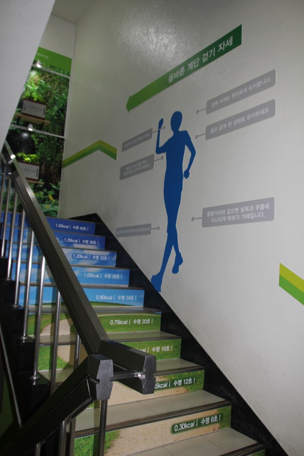 또한, 시작점인 1층 계단에는 사람의 움직임에 자동으로 반응하는 인체감지형 자동음향기기를 설치해 자연의 소리와 클래식 음악을 들을 수 있도록 하였으며, 벽면에는 나무와 녹색의 숲을 연상할 수 있도록 디자인하여 직원들이 친근하게 다가올 수 있도록 하였다.