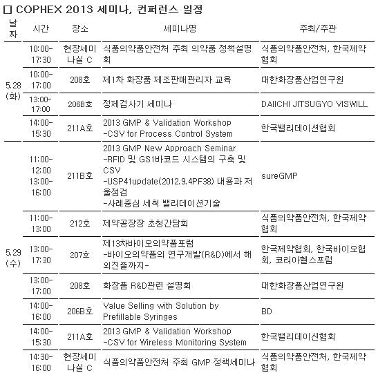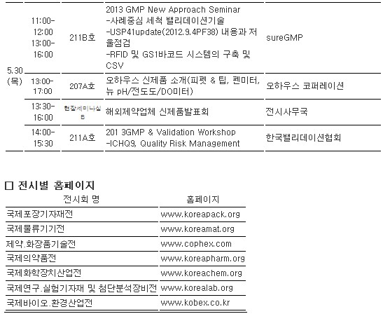 전시회를 주관하는 경연전람 김영수 대표는 “올해 8회째를 맞이하는 이번 행사는 국제규모의 출품기업과 전시면적을 이미 확보했으며, 동기간 포장물류전인 국제포장기자재전(KOREA PACK), 화공기술이 선보이는 화학장치산업전(KOREA CHEM 2013), 실험분석기기전시회(KOREA LAB 2013)이 같은 장소에서 열리게 돼 화장품, 제약, 식품분야의 종사자들이 단 한 번의 관람으로 관련기술을 모두 볼 수 있게 기획한 행사“라고 밝혔다.