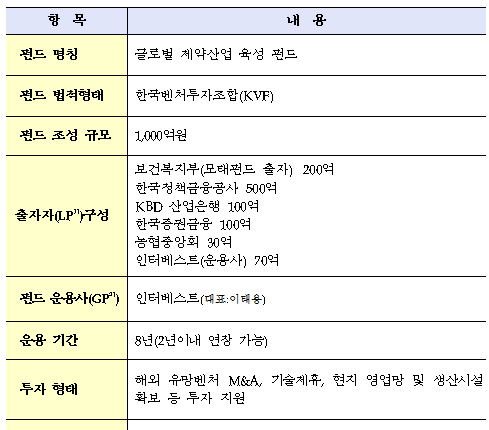 국내 제약기업의 기술제휴와 해외시장 진출 지원을 주 투자대상으로, 제약산업의 장기간 투자 특성을 반영해 투자·회수기간을 8년(2년 연장 가능)으로 설계하고, 특히 자본력이 취약한 중소·벤처 제약사에 대한 투자를 목적으로 하는 한국벤처투자조합(KVF) 형태로 조성됐다.