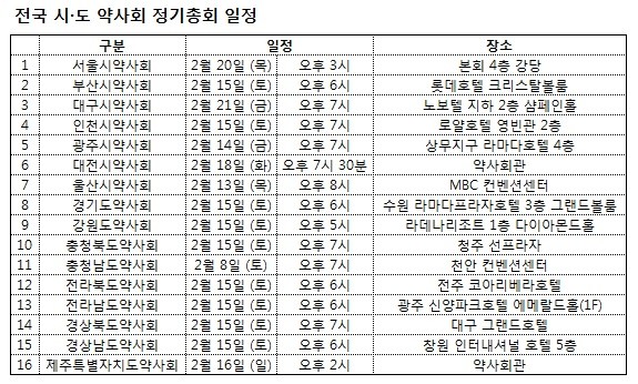 한편 올해 전국 시·도 약사회 정기총회는 내달 8일부터 21일까지 진행된다.