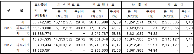 2013년도 요양급여비용은 50조 7,426억원으로 전년대비 5.2% 증가했으며, 건강보험 가입자 1인당 요양급여비용은 102만원으로 전년대비 4.5% 증가하고, 건강보험 가입자 1인당 요양기관 이용일수는 19일로 나타났다.