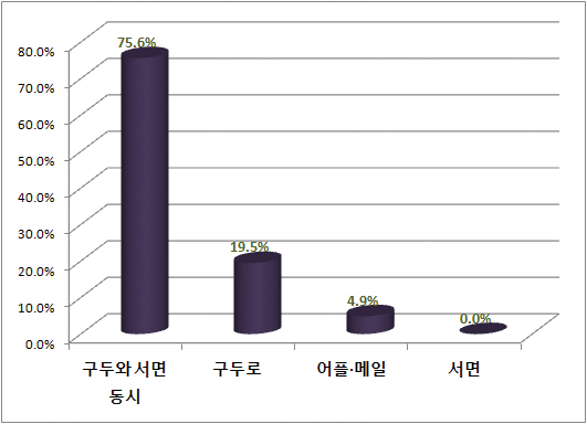 답변을 취합한 결과 응답자의 75.6%는 구두와 서면으로 복약지도를 하겠다고 답했으며, 구두로 하겠다는 응답은 19.5%였다. 또, 어플리케이션이나 메일로 하겠다는 답변은 4.9%였다. 특히 서면으로만 복약지도를 하겠다는 응답자는 한명도 없었다.