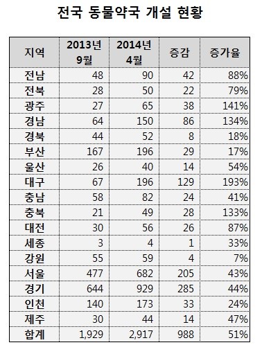 전국 동물약국 숫자가 6개월여 사이에 1,000곳 가량 급증한 것으로 파악됐다. 주로 서울을 비롯한 대도시에 동물약국이 많은 것으로 나타났다.