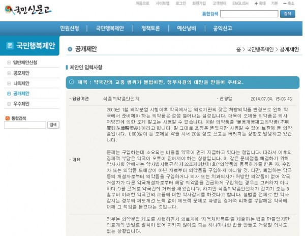 최근 국민신문고 국민행복제안에는 '약국간의 교품 행위가 불법이면, 정부 차원의 대안을 만들어 주세요'라는 글이 게시됐다.