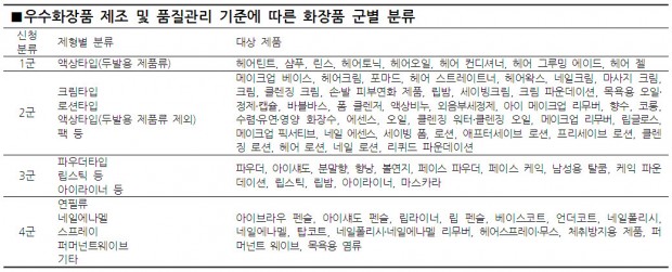 화장품 군별 분류는 △1군:액상타입(두발용 제품류) △2군:크림타입, 로션타입, 액상타입(두발용 제품류 제외), 팩 등 △3군:파우더타입, 립스틱 등, 아이라이너 등 △4군:연필류, 네일에나멜, 스프레이, 퍼머넌트웨이브, 기타 등으로 나뉘어 있다.