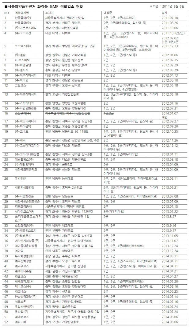 식약처에서 가장 먼저 CGMP적합업소 인증을 받은 기업은 한국콜마로 2011년 7월 18일 받았다.
