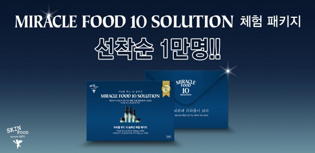 스킨푸드가 신제품 ‘미라클 푸드 10 솔루션’ 라인 출시를 기념해 17일부터 23일까지 스킨푸드 홈페이지와 모바일에서 선착순 1만명 대상 체험 패키지 증정 이벤트를 실시한다.