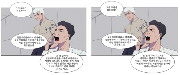 기존에는 '몇년 사이 일반약국이 동물약품을 취급하면서 덩달아 너도나도 들이기는 했지. 수의사 처방전 없이도 파는 곳들이 있어서 구하기가 쉽거든, 가격도 싸고'라는 내용을 담고 있어 동물약국 관계자들의 항의가 있었다.