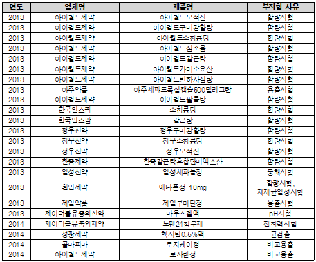 남윤인순 의원은 “의약품 수거검사결과 일부 제약업체의 경우 주성분 함량미달, 용출 및 붕해시험 미달 등 품질부적합 판정을 받는 사례가 반복적으로 발생하고 있는 것은 큰 문제”라고 밝혔다.