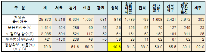 지역별 불균형도 심각해서, 신생아집중치료실 병상 확보 비율을 보면 충북이 40.6%로 가장 낮았고, 전남․광주(53.0%), 경기(54.6%), 인천(59.0%) 순으로 병상 확보 비율이 낮았다.