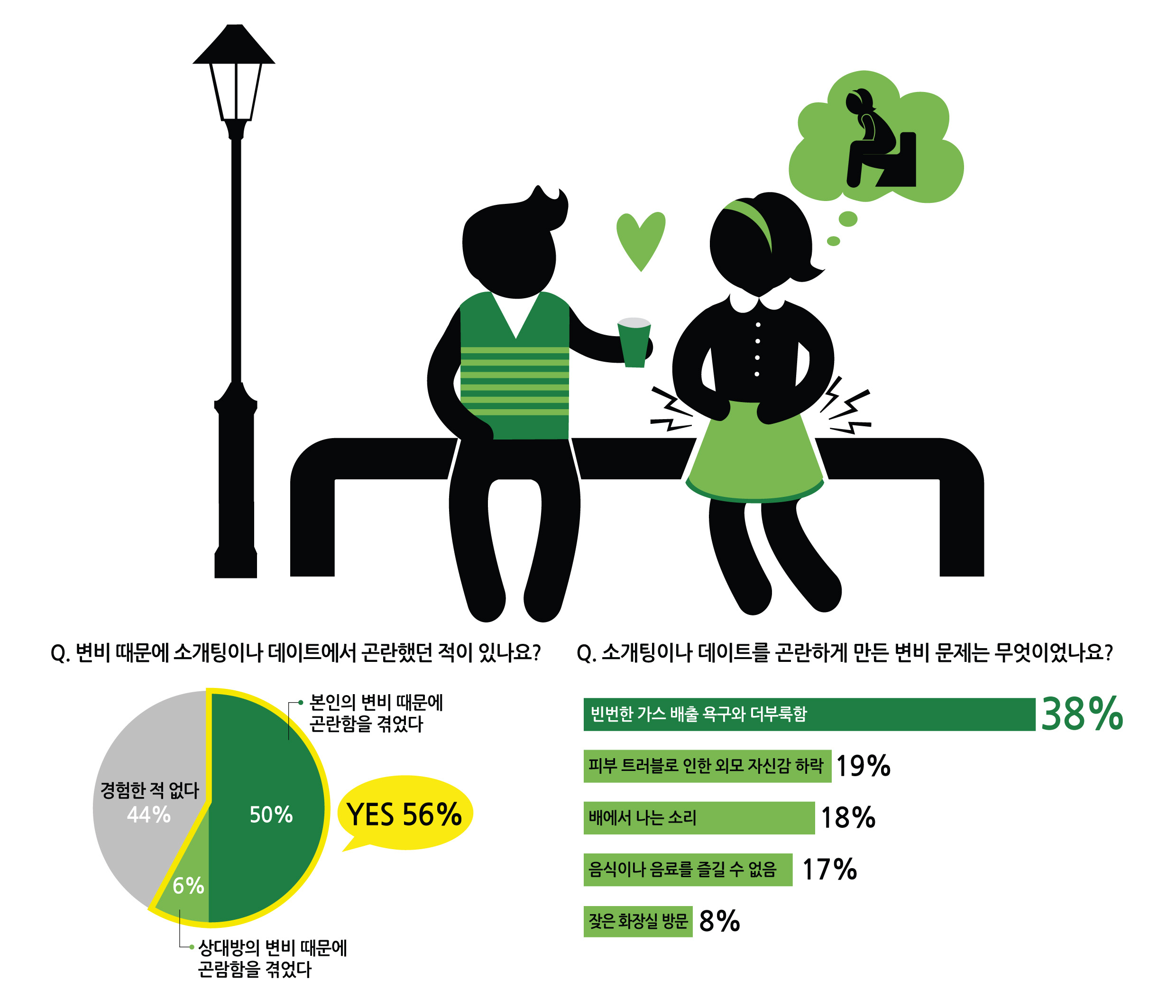 이번 설문조사 결과에 따르면, 응답자의 두 명 중 한 명 이상(56%, 661명)이 실제로 본인이나 상대방의 변비 때문에 데이트나 소개팅에서 곤란한 경험이 있다고 답해 많은 여성들이 연인과의 로맨틱한 순간에도 변비로 인해 불편함을 겪을 뿐만 아니라 변비가 소개팅과 데이트의 성공 여부에도 상당한 영향을 미치는 것으로 드러났다.