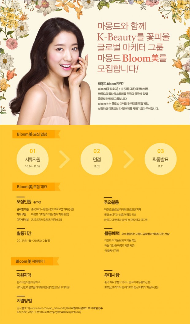마몽드 ‘Bloom 美’ 지원방법은 공식 블로그(http://blog.naver.com/ap_mamonde)에서 지원서를 다운로드 후 작성하여 이메일로 접수하면 된다.