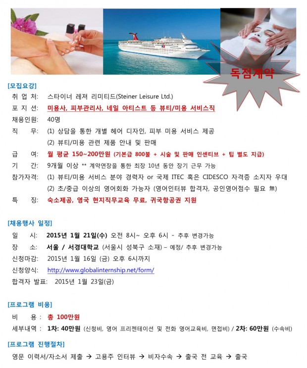 모집 대상은 뷰티·미용 서비스 관련 전공자 및 졸업자이며, 취업처는 미국 스타이너 레저 리미티드다. 근무지는 유럽, 북미, 아시아 등 배정 크루즈에 따라 상이하고, 근무 기간은 9개월 이상으로 계약 연장을 통해 최장 10년까지 장기 근무가 가능하다. 모집 인원은 약 40명.